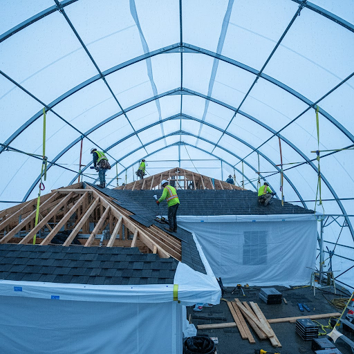 Professional shrink wrap systems provide a durable, weather-resistant barrier that protects structures while allowing work to continue safely — even during adverse conditions.