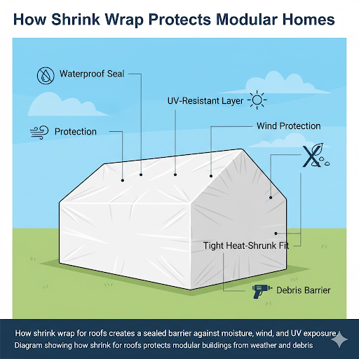 During transportation, modular homes are exposed to rain, snow, high winds, and road debris. A shrink wrap roof acts as a protective shell, preventing moisture from entering roof assemblies, insulation, or interior finishes.